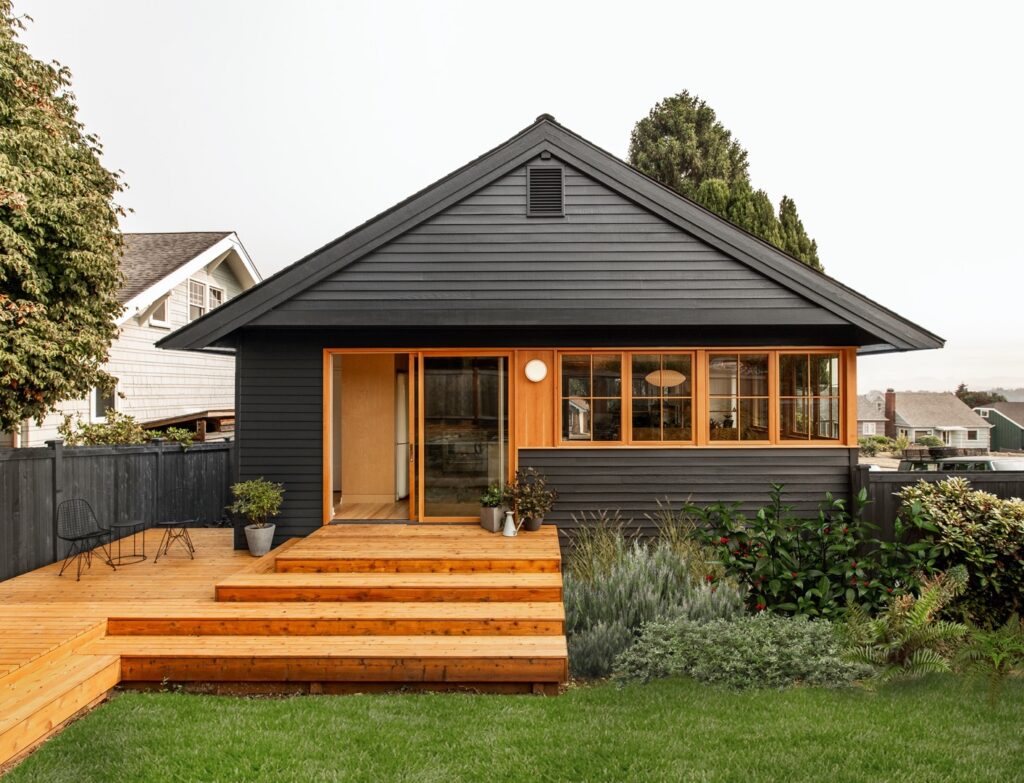 自西雅圖繁忙的市區向南延伸,城市邊緣的郊區裡喧鬧聲逐漸稀落,地平線上可見遠方雷尼爾山(Mount Rainier)高聳矗立,白雪靄靄的峰頂隨一日的晨曦和夕陽,映射出夢幻又迷人的光暈。在這片的寧靜的住宅區中,一幢黑色的小屋「Black Sheep Remodel」靜靜佇立於街角,小巧卻沈穩的外觀格外醒目。這座落成於 1921 年的住宅,原為那個年代常見的勞工居所,由數個緊湊的矩形小房間相連而成;近期在設計團隊 SHED Architecture & Design 的翻修下,褪去不合時宜的機能與格局,以更符合當代生活的設計,讓這座百年小屋走進新世紀。