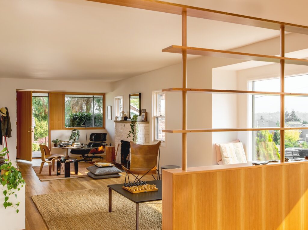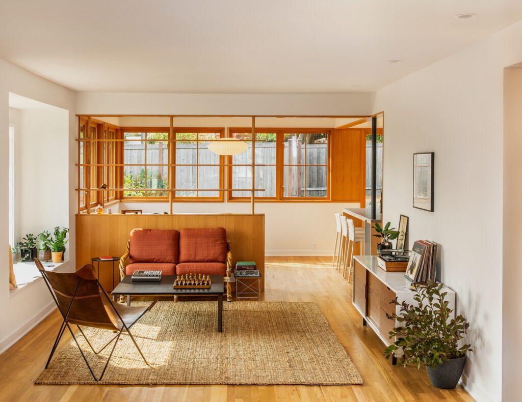 量身打造的木質格柵牆櫃取代舊有牆面,消減原有隔間的窒礙與壓迫,連結起底部的餐廳與廚房,將一樓起居空間整合成流動的開放式格局。廚房選用 Kerf 的木材櫥櫃,中島上一根策略性安置的立柱不僅具結構承重的功能,也成為視覺的新支點。迎著後方庭院的迷人山景,餐廳木窗線條與格柵牆櫃彼此呼應,世紀中期現代主義(Mid-century modern)的簡約風格,在窗外湧入的日光下顯得明亮又和諧。